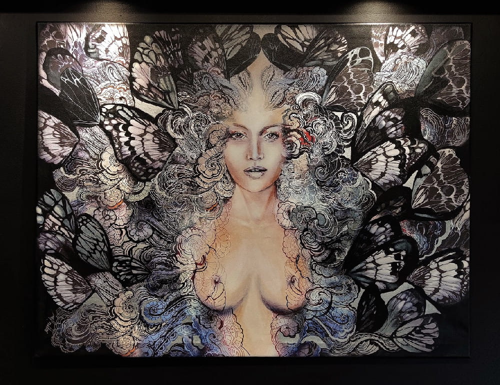 "Carmen Freewolna Black Butterfly", 130x100 cm, nowa odsłona kultowego obrazu w wersji Butterfly, z serii Freewolne Pastereczki, w której Maggie przemyca symbolikę polskich obyczajów; ta seria zaczęła powstawać w 100-letnią rocznicę uzyskania przez Polki praw wyborczych po odzyskaniu Niepodległości, stąd ten przewrotny tytuł, który można odczytać jako interferencję pojęć „wolność” i „frywolność”, według Maggie wolność słowa i wolność myśli.