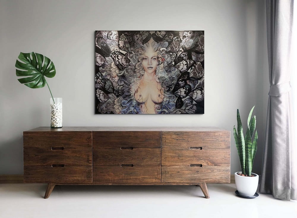 Obraz Maggie Piu wykonany w technice mieszanej na bazie giclee, druku na płótnie jako podkładu, wykończony następnie przez malarkę ręcznie (akryl, złocenia, srebrzenia, tusz, farby inne i techniki własne artystki) - dostępny na zamówienie w dowolnych rozmiarach.