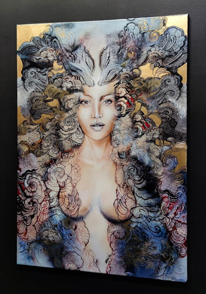 Obraz Maggie Piu wykonany w technice mieszanej na bazie giclee, druku na płótnie jako podkładu, wykończony następnie przez malarkę ręcznie (akryl, złocenia, srebrzenia, tusz, farby inne i techniki własne artystki) - dostępny na zamówienie w dowolnych rozmiarach.