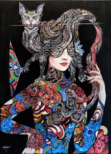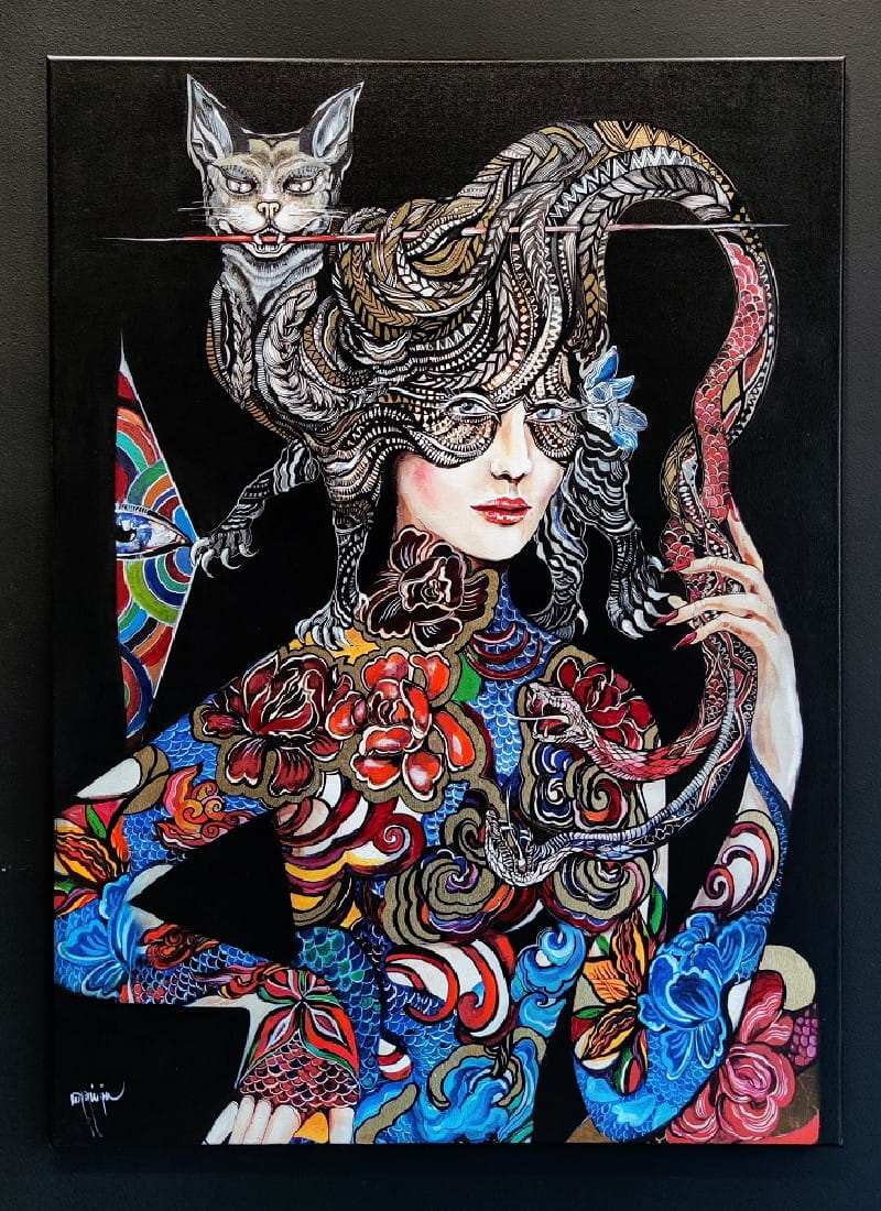 "Dwa węże walczą o me serce, ale moja głowa należy do kota" - 80x110 cm, obraz Maggie Piu w technice mieszanej to sposób na wprowadzenie sztuki do wnętrza oraz nadanie mu oryginalnego niebanalnego charakteru. Doskonałe na prestiżowy i niezapomniany prezent. To także świetny sposób na rozsądne budżetowo zapoczątkowanie lub kontynuowanie przygody kolekcjonerskiej.