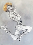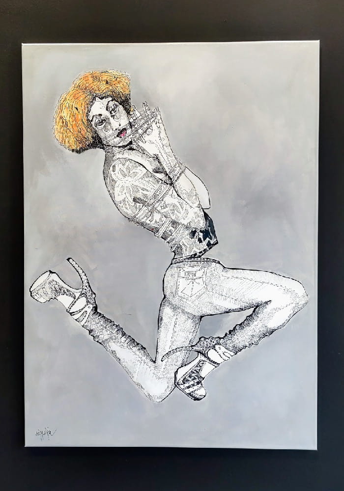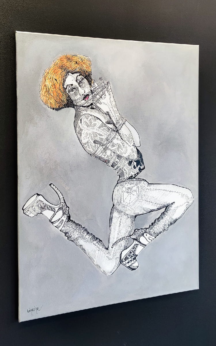 Obraz "Fashion Games I", 80x110 cm, na podstawie rysunku Maggie z wcześniejszego okresu twórczości. Rysunek został przeniesiony na płótno i wykończony farbami akrylowymi oraz technikami własnymi.