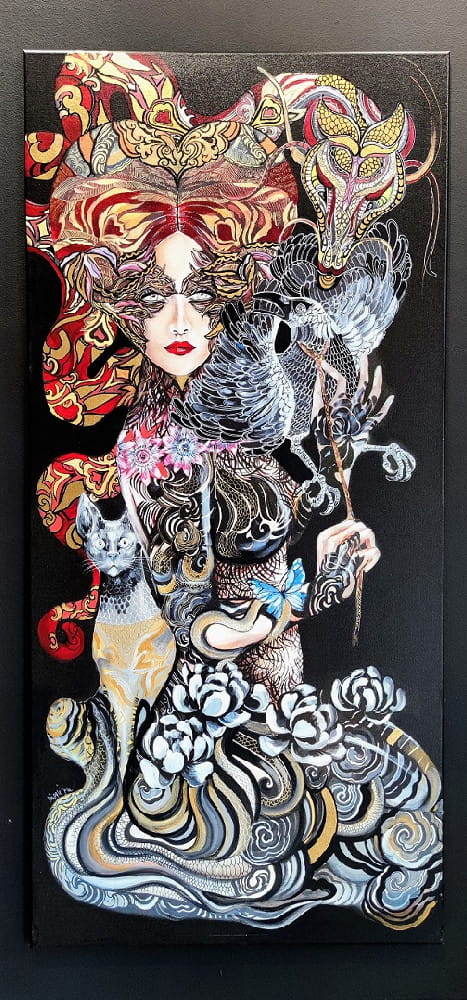 Obraz Maggie Piu wykonany w technice mieszanej na bazie giclee, druku na płótnie jako podkładu, wykończony następnie przez malarkę ręcznie (akryl, złocenia, srebrzenia, tusz, farby inne i techniki własne artystki) - dostępny na zamówienie w dowolnych rozmiarach.