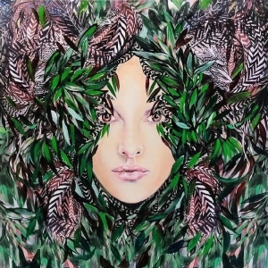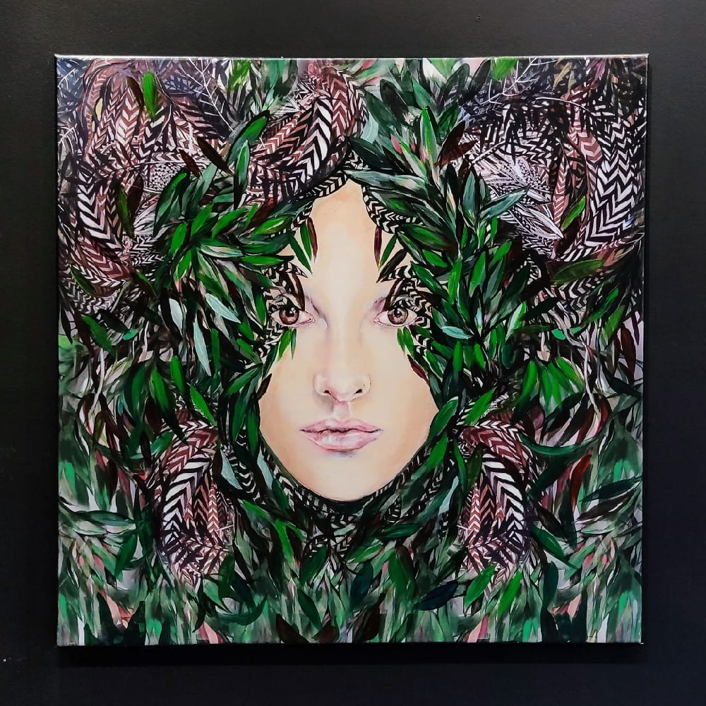 "Heterozja Ririva", 80x80 cm, tech-mix (akryl, digital, tusz), obraz Maggie Piu z serii Heterozje. Idea techmix wykorzystywana w seriach Heterozje i Hybrydy polega na łączeniu kilku moich obrazów w jeden."Heterozja Ririva" to Medusa jako zmixowana "Rita" i "Viridis".
