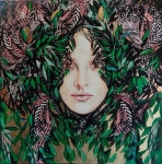 "Heterozja Ririva", 80x80 cm, tech-mix (akryl, digital, tusz, szlagmetal), obraz Maggie Piu z serii Heterozje. Idea techmix wykorzystywana w seriach Heterozje i Hybrydy polega na łączeniu kilku moich obrazów w jeden."Heterozja Ririva" to Medusa jako zmixowana "Rita" i "Viridis".