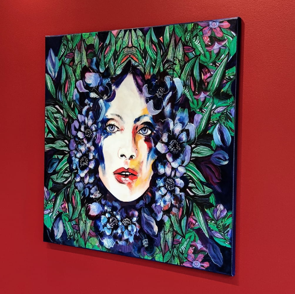 Obraz Maggie Piu wykonany w technice mieszanej na bazie giclee, druku na płótnie jako podkładu, wykończony następnie przez malarkę ręcznie (akryl, złocenia, srebrzenia, tusz, farby inne i techniki własne artystki) - dostępny na zamówienie w dowolnych rozmiarach.