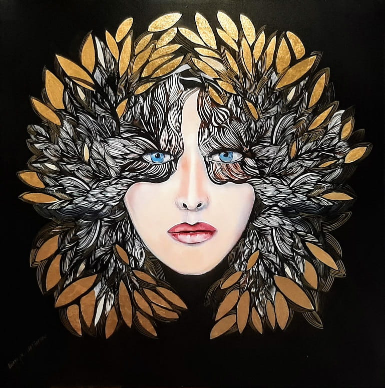 Obraz Maggie Piu wykonany w technice mieszanej na bazie giclee, druku na płótnie jako podkładu, wykończony następnie przez malarkę ręcznie (akryl, złocenia, srebrzenia, tusz, farby inne i techniki własne artystki) - dostępny na zamówienie w dowolnych rozmiarach.