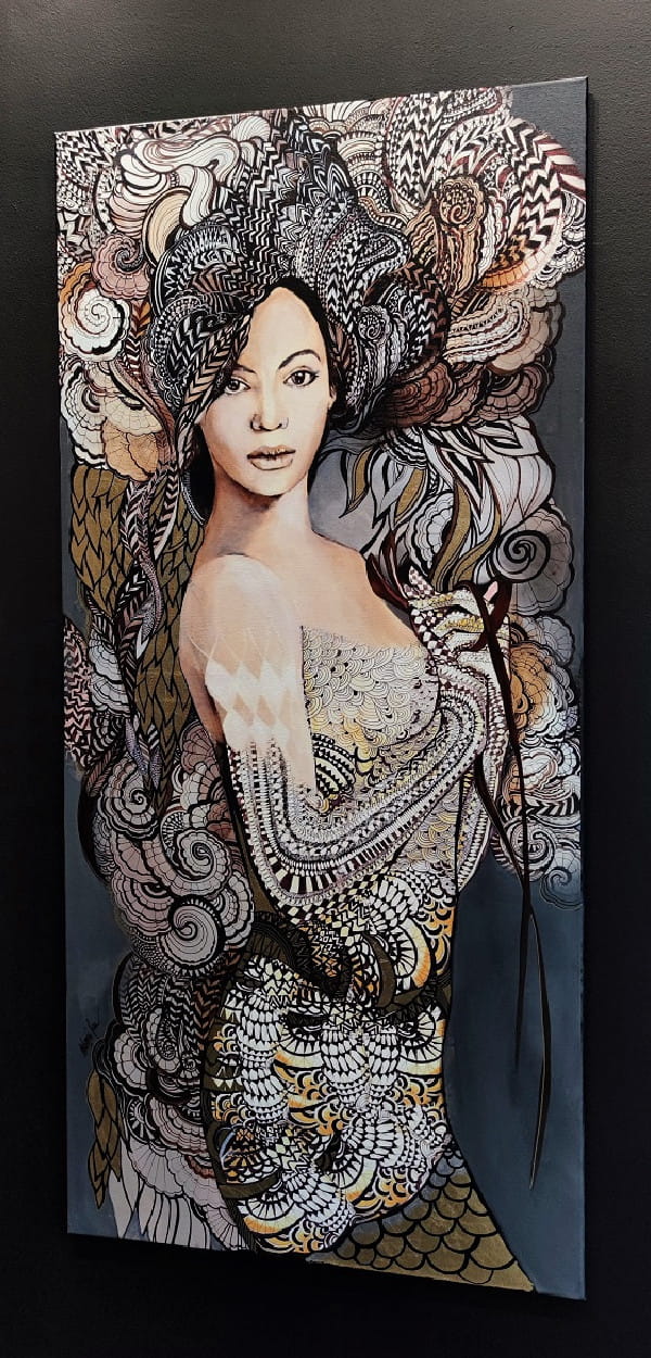 "Madame Butterfly B.", 70x150 cm, kanoniczny obraz z serii PopDivy, którego inspiracją była opera, a w rolę głównych bohaterek wcielają się prawdziwe kobiety ze świata współczesnego filmu czy muzyki, ikony popkultury. W roli Cio-cio-san vel Butterfly, głównej bohaterki opery Giacoma Pucciniego w obrazie Maggie Piu została obsadzona Beyonce.