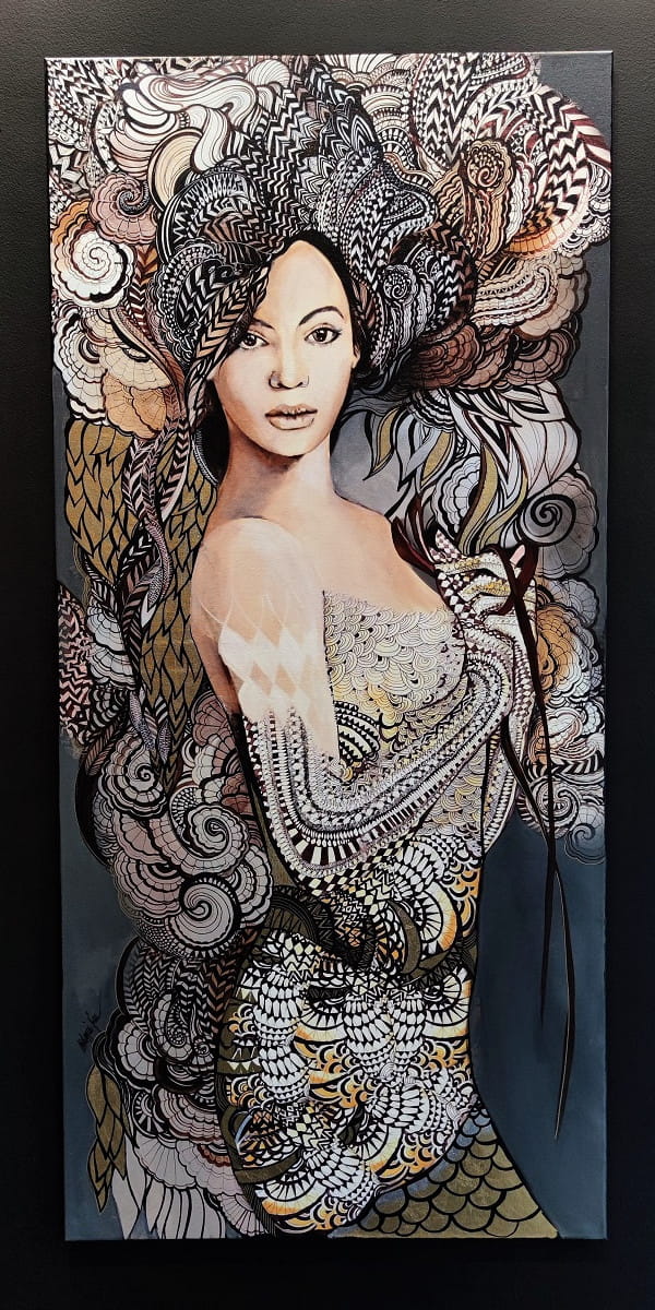 Obraz Maggie Piu wykonany w technice mieszanej na bazie giclee, druku na płótnie jako podkładu, wykończony następnie przez malarkę ręcznie (akryl, złocenia, srebrzenia, tusz, farby inne i techniki własne artystki) - dostępny na zamówienie w dowolnych rozmiarach.
