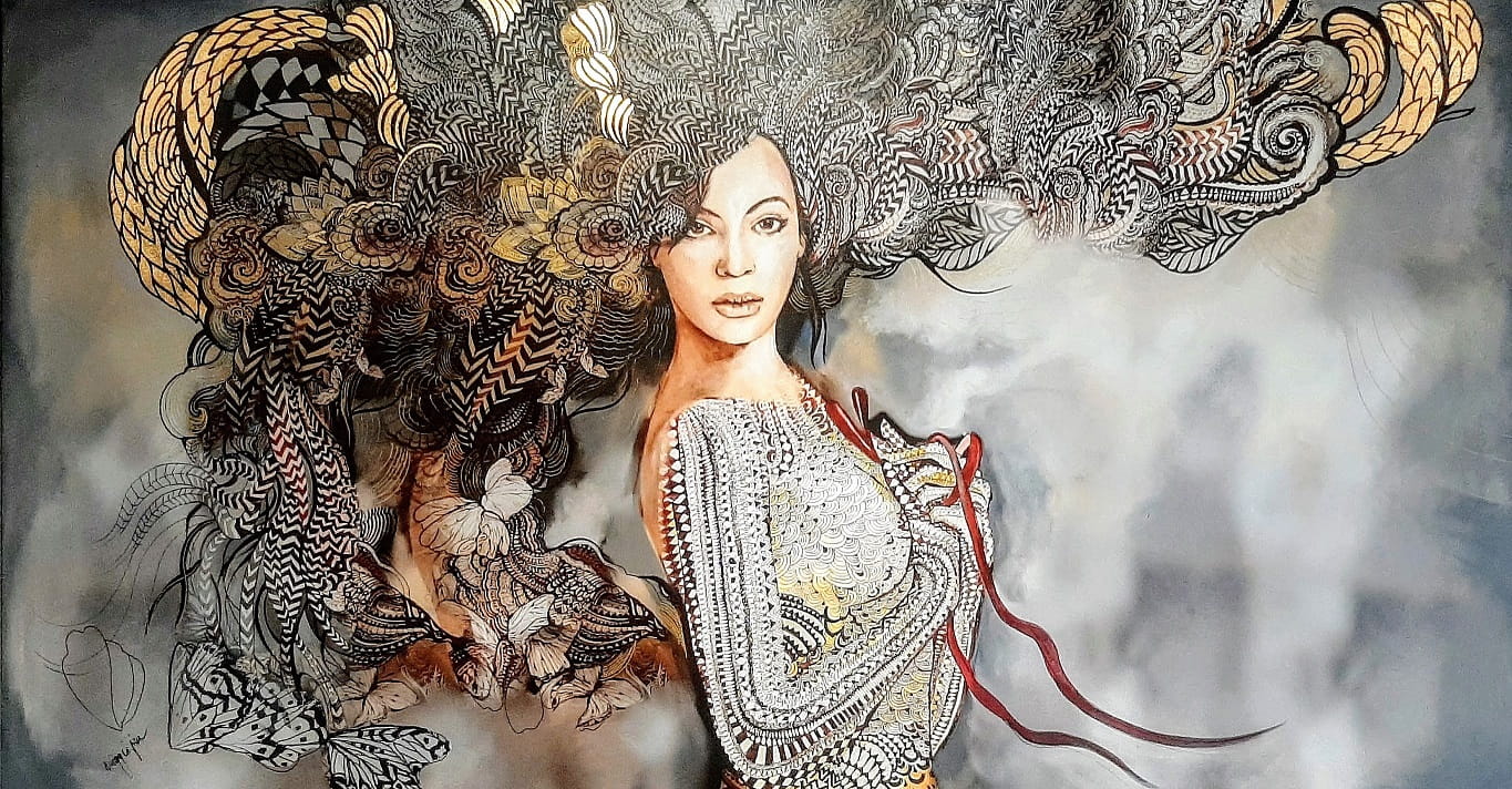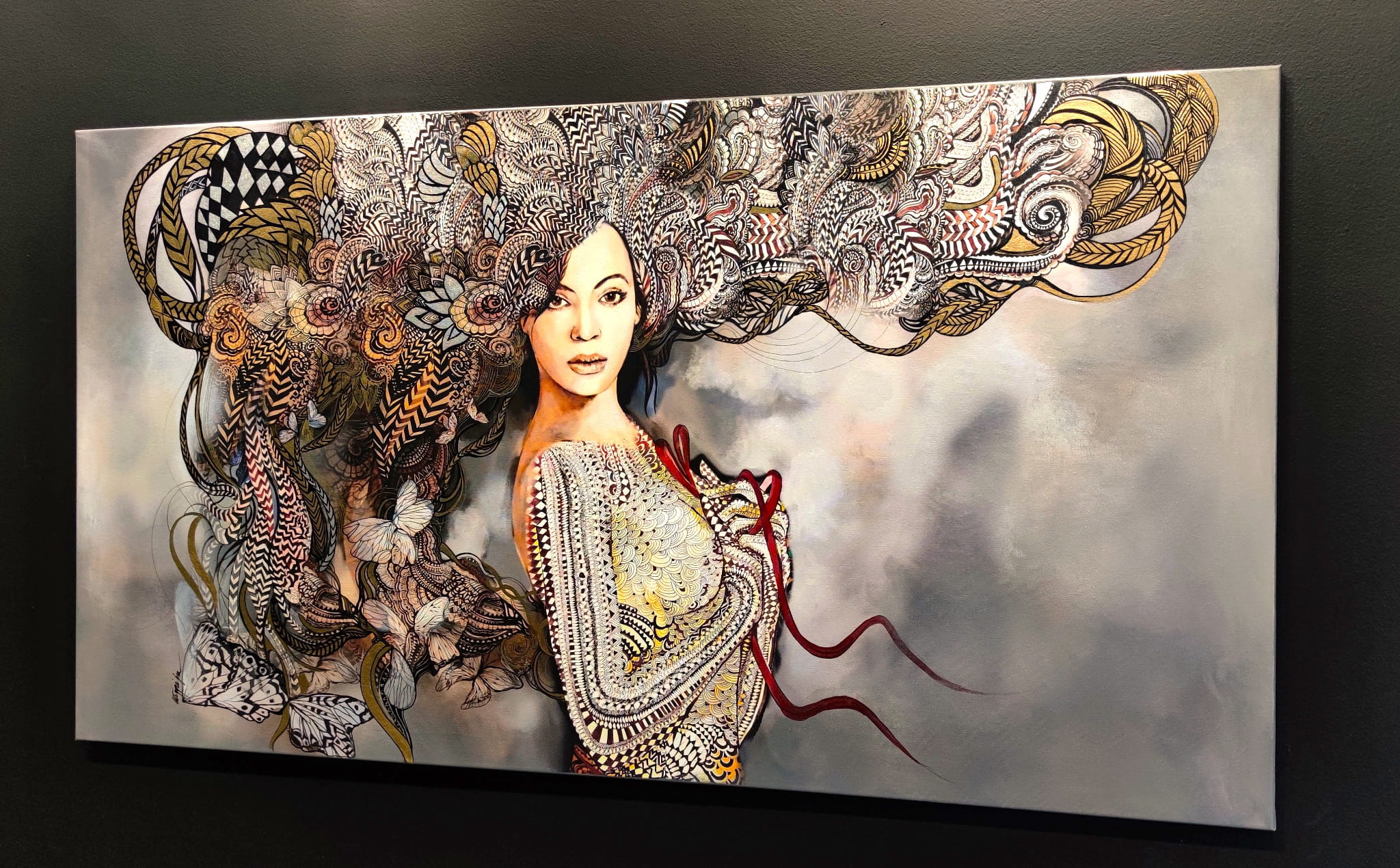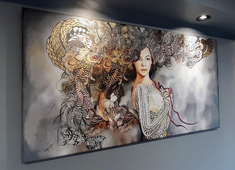 Obraz Maggie Piu wykonany w technice mieszanej na bazie giclee, druku na płótnie jako podkładu, wykończony następnie przez malarkę ręcznie (akryl, złocenia, srebrzenia, tusz, farby inne i techniki własne artystki) - dostępny na zamówienie w dowolnych rozmiarach.