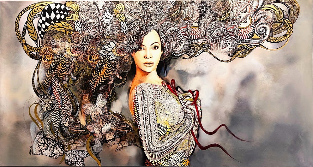 "Madame Butterfly PopDiva Grey", 150x80 cm, kanoniczny obraz w wersji horyzontalnej z serii PopDivy, którego inspiracją była opera, a w rolę głównych bohaterek wcielają się prawdziwe kobiety ze świata współczesnego filmu czy muzyki, ikony popkultury. W roli Cio-cio-san vel Butterfly, głównej bohaterki opery Giacoma Pucciniego w obrazie Maggie Piu została obsadzona Beyonce.