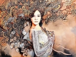 "Madame Butterfly Sepia", 120x90 cm, kanoniczny obraz w wersji horyzontalnej z serii PopDivy, którego inspiracją była opera, a w rolę głównych bohaterek wcielają się prawdziwe kobiety ze świata współczesnego filmu czy muzyki, ikony popkultury. W roli Cio-cio-san vel Butterfly, głównej bohaterki opery Giacoma Pucciniego w obrazie Maggie Piu została obsadzona Beyonce. Temat - Madame Butterfly z rękami złożonymi na piersi splecionymi miedzianą wstążką, układ poziomy, kolorystyka sepiowa, miedziano-złota