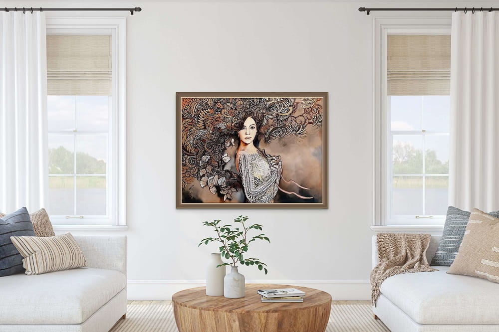 Obraz Maggie Piu wykonany w technice mieszanej na bazie giclee, druku na płótnie jako podkładu, wykończony następnie przez malarkę ręcznie (akryl, złocenia, srebrzenia, tusz, farby inne i techniki własne artystki) - dostępny na zamówienie w dowolnych rozmiarach.