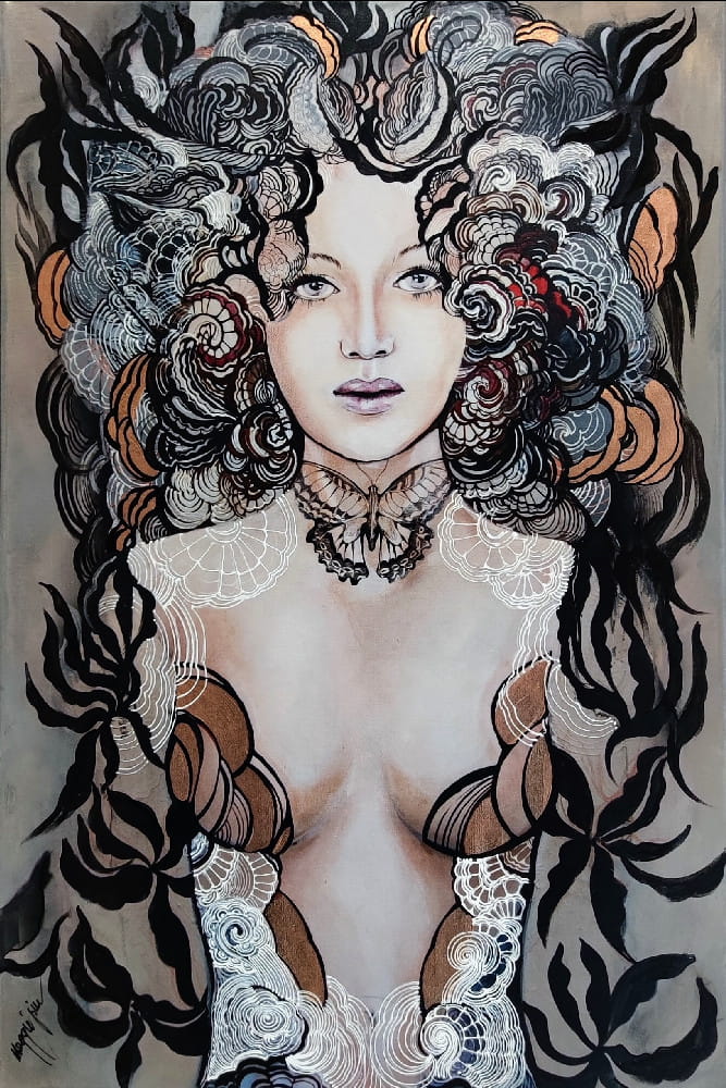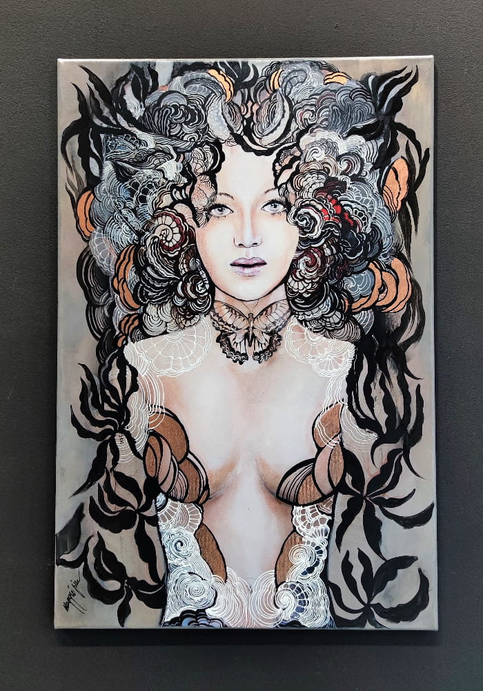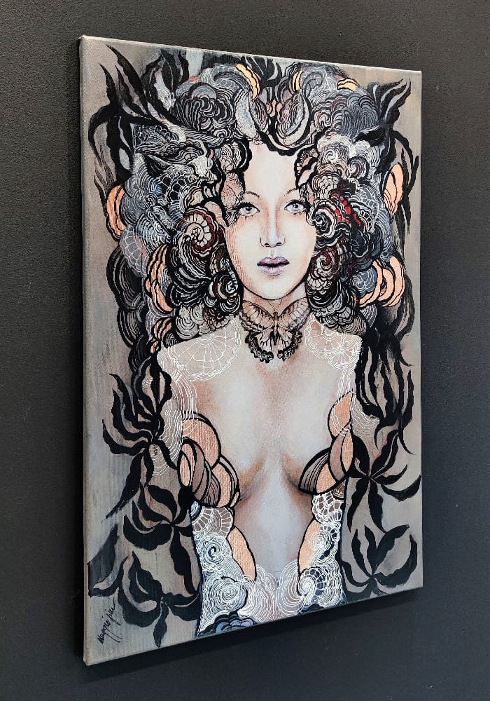 Obraz Maggie Piu wykonany w technice mieszanej na bazie giclee, druku na płótnie jako podkładu, wykończony następnie przez malarkę ręcznie (akryl, złocenia, srebrzenia, tusz, farby inne i techniki własne artystki) - dostępny na zamówienie w dowolnych rozmiarach.