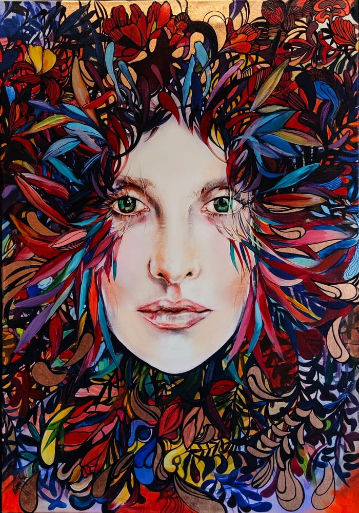 "Medusa Orzo Copper", 70x100 cm, obraz z serii Medusy, cyklu będącego wariacją na temat kobiecego piękna i charakteru, wyrażonego w spojrzeniu, oczach, rysach twarzy otoczonych nastrojową, klimatyczną dekoracją, co w kontekście mitologicznej symboliki nabiera dodatkowej wieloznaczeniowej dynamiki.