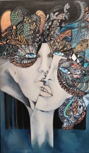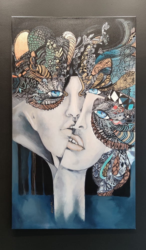 Obraz Maggie Piu wykonany w technice mieszanej na bazie giclee, druku na płótnie jako podkładu, wykończony następnie przez malarkę ręcznie (akryl, złocenia, srebrzenia, tusz, farby inne i techniki własne artystki) - dostępny na zamówienie w dowolnych rozmiarach.