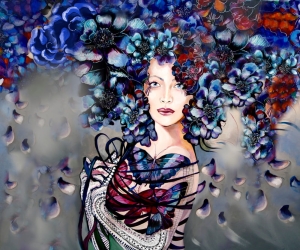 Obraz Maggie Piu wykonany w technice mieszanej na bazie giclee, druku na płótnie jako podkładu, wykończony następnie przez malarkę ręcznie (akryl, złocenia, srebrzenia, tusz, farby inne i techniki własne artystki) - dostępny na zamówienie w dowolnych rozmiarach.