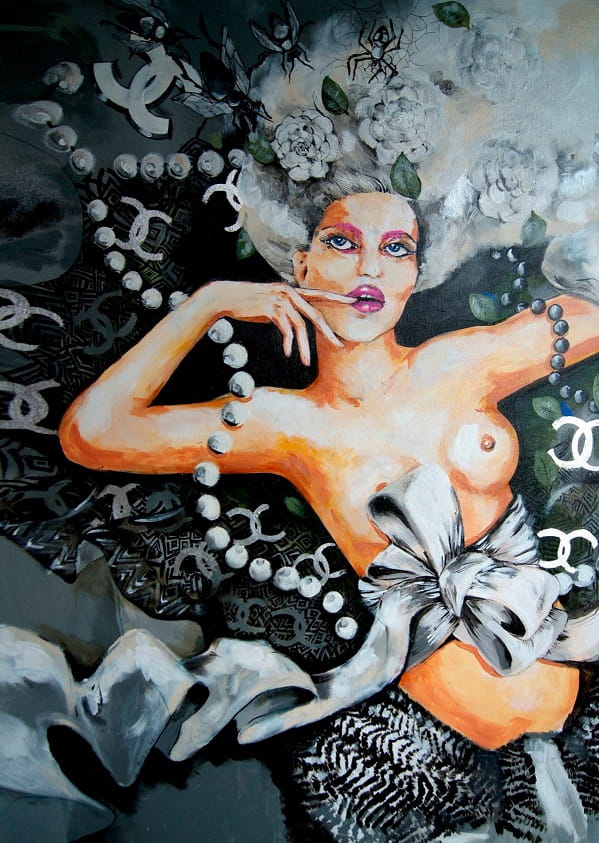 Obraz "Pensieri Coco", 70x100 cm, na podstawie oryginału z cyklu „Fashion Games”, inspirowanego światem mody. Praca z okresu 2009-2013.