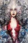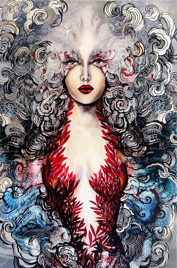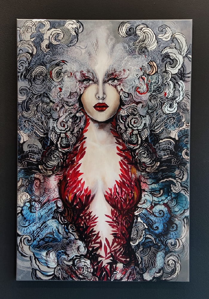 Obraz Maggie Piu wykonany w technice mieszanej na bazie giclee, druku na płótnie jako podkładu, wykończony następnie przez malarkę ręcznie (akryl, złocenia, srebrzenia, tusz, farby inne i techniki własne artystki) - dostępny na zamówienie w dowolnych rozmiarach.