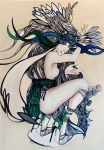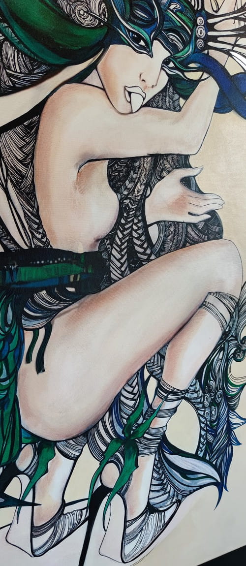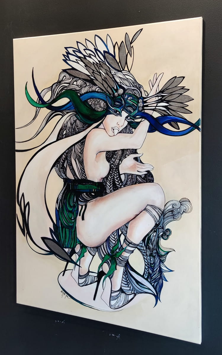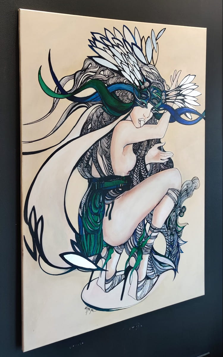 Obraz "Smutna Kochanka", 90x130 cm, na podstawie rysunku Maggie z wcześniejszego okresu twórczości. Rysunek został przeniesiony na płótno i wykończony farbami akrylowymi oraz technikami własnymi.