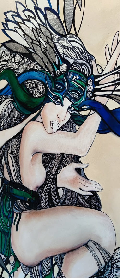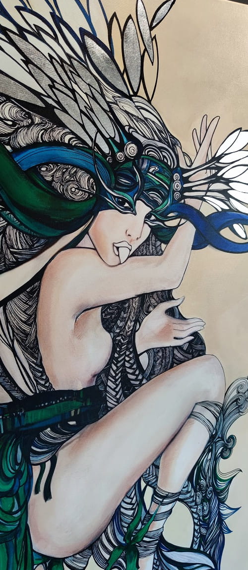 Obraz Maggie Piu wykonany w technice mieszanej na bazie giclee, druku na płótnie jako podkładu, wykończony następnie przez malarkę ręcznie (akryl, złocenia, srebrzenia, tusz, farby inne i techniki własne artystki) - dostępny na zamówienie w dowolnych rozmiarach.
