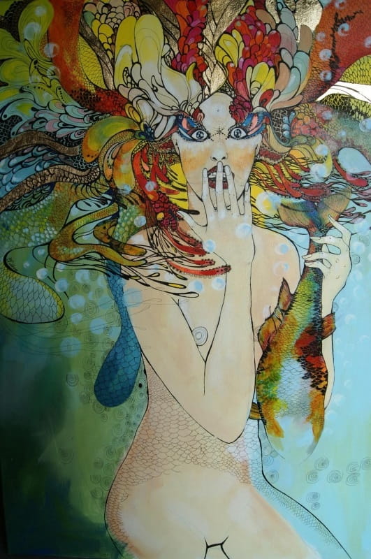 Obraz Maggie Piu wykonany w technice mieszanej na bazie giclee, druku na płótnie jako podkładu, wykończony następnie przez malarkę ręcznie (akryl, złocenia, srebrzenia, tusz, farby inne i techniki własne artystki) - dostępny na zamówienie w dowolnych rozmiarach.