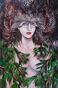 "Viridis", 60x90 cm, obraz z cyklu "Raj Utracony", zanurzonego w bogatej, kolorowej, roślinnej i kwiatowej ornamentyce, będącym wyrazem tęsknoty do Edenu.