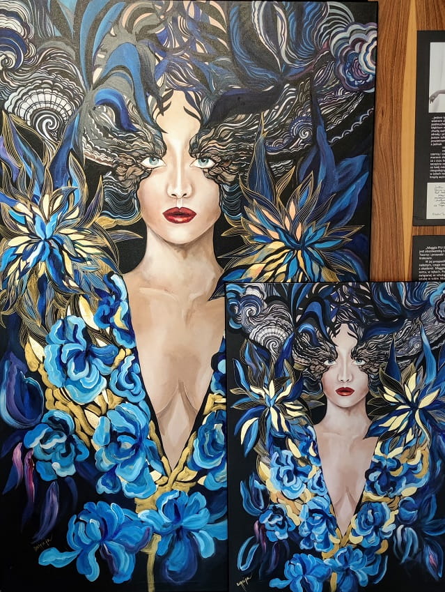 "Goldiva Szafiro", 140x220 cm, obraz z 2021 r. z cyklu „Goldivy”, barokowej, bogatej zdobniczo, złotej serii inspirowanej między innymi wzorami z dawnych tkanin, w której pojawiają się również rozmaite motywy stale obecne w twórczości Maggie Piu.
