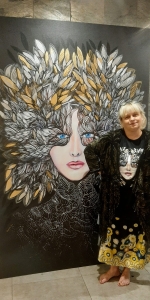 "Lady Gorudo", 130x100 cm, kultowy obraz z cyklu „Czarne Gejsze”, inspirowanego bogatą kulturą Japonii, tatuażem, ornamentem i symboliką zakorzenioną w kolorycie Kraju Kwitnącej Wiśni.