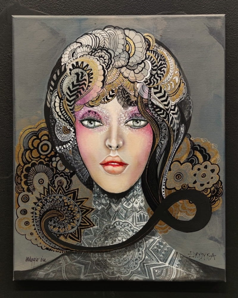 Styl: Połączenie portretu kobiecego z bogatym ornamentem i detalami graficznymi.