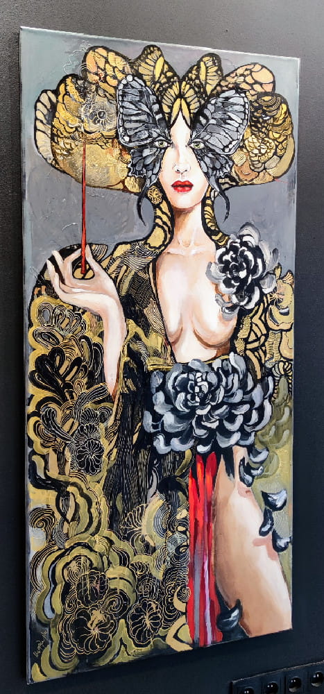 Oryginał z cyklu „Czarne Gejsze”, inspirowanego bogatymi kulturami Dalekiego Wschodu, w szczególności ornamentem i symboliką zakorzenioną w kolorycie Kraju Kwitnącej Wiśni, ale także Chin oraz tatuażem.