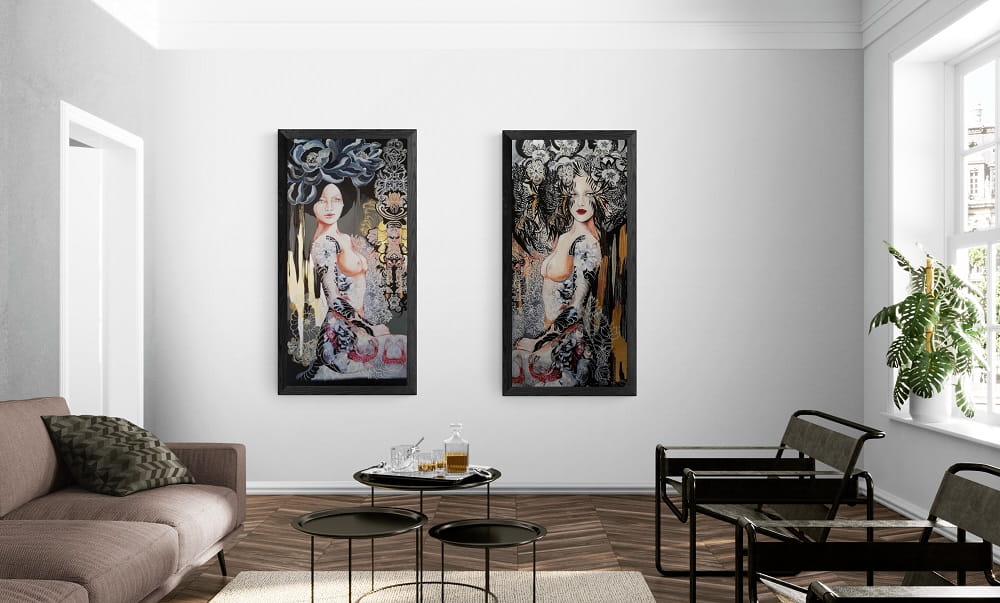 Oryginał z cyklu „Czarne Gejsze”, inspirowanego bogatą kulturą Japonii, tatuażem, ornamentem i symboliką zakorzenioną w kolorycie Kraju Kwitnącej Wiśni.