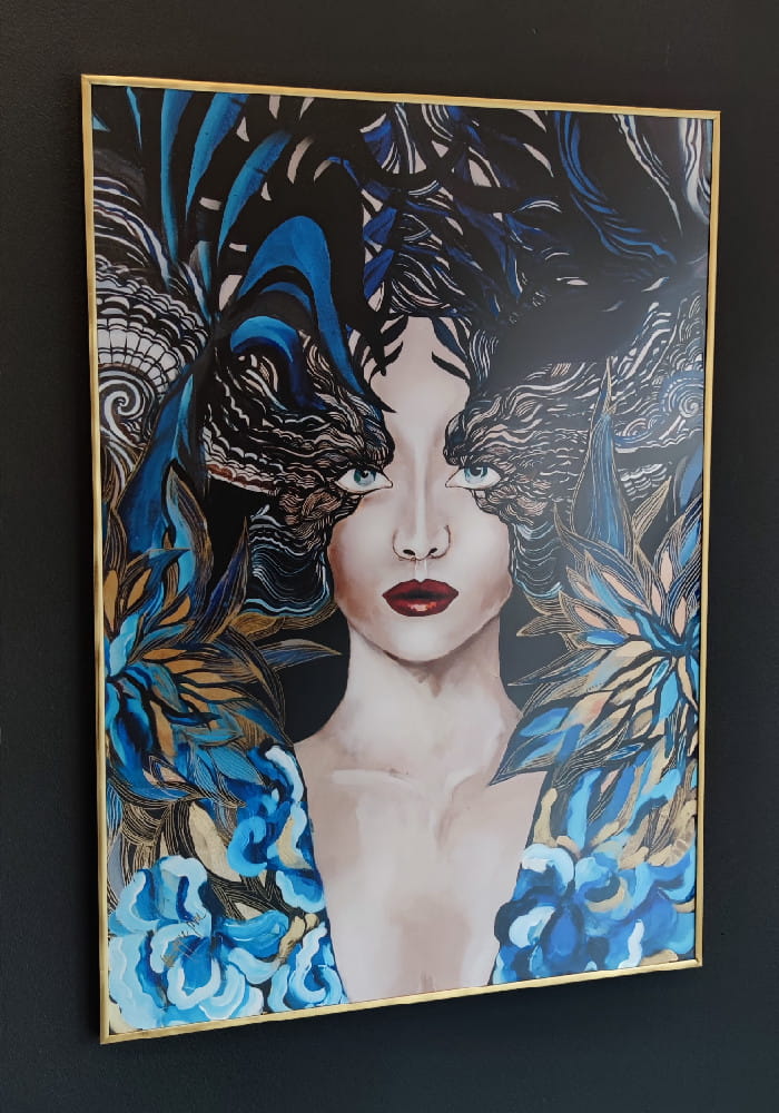 Art-plakat „Goldiva Szafiro II” 70/100 cm to kopia fragmentu obrazu Maggie Piu z cyklu „Goldivy”, barokowej, bogatej zdobniczo, złotej serii inspirowanej między innymi wzorami z dawnych tkanin, w której pojawiają się również rozmaite motywy stale obecne w twórczości Maggie Piu.