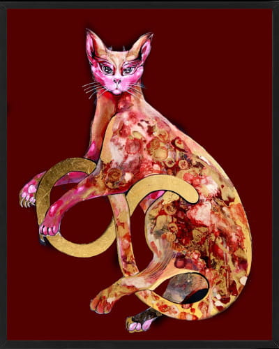 Art-plakat „Kizia na bordowym” 40x50 cm to reprint obrazu Maggie Piu z cyklu „Goldivy”, barokowej, bogatej zdobniczo, złotej serii inspirowanej między innymi wzorami z dawnych tkanin, w której pojawiają się również rozmaite motywy stale obecne w twórczości Maggie Piu.
