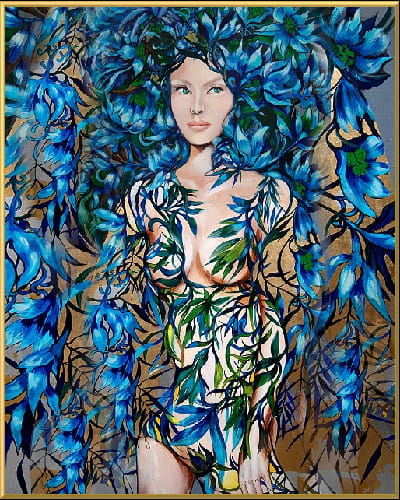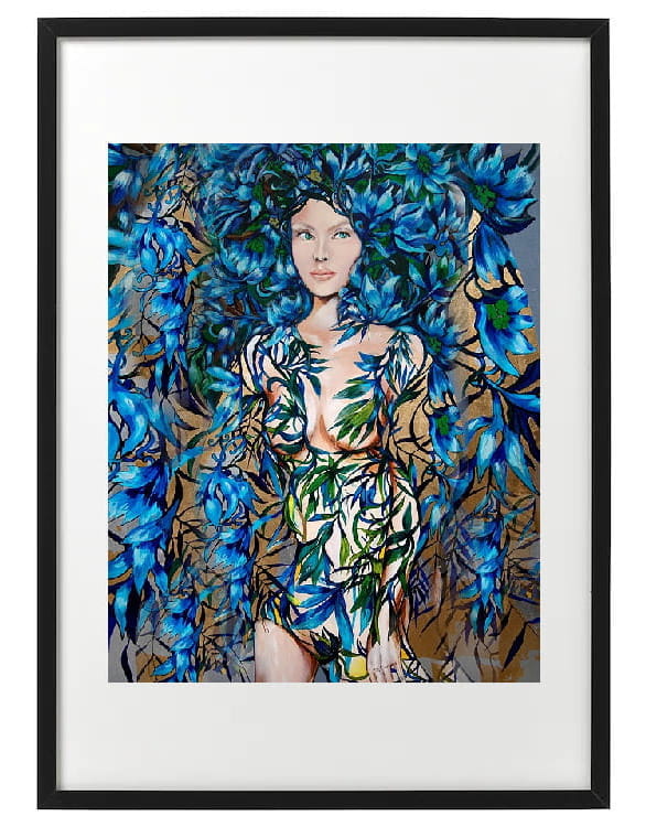 Art-plakat „Niebieska” 40x50 cm to kopia obrazu Maggie Piu z cyklu „Raj Utracony", zanurzonego w bogatej, kolorowej, roślinnej i kwiatowej ornamentyce, będącym wyrazem tęsknoty do Edenu.