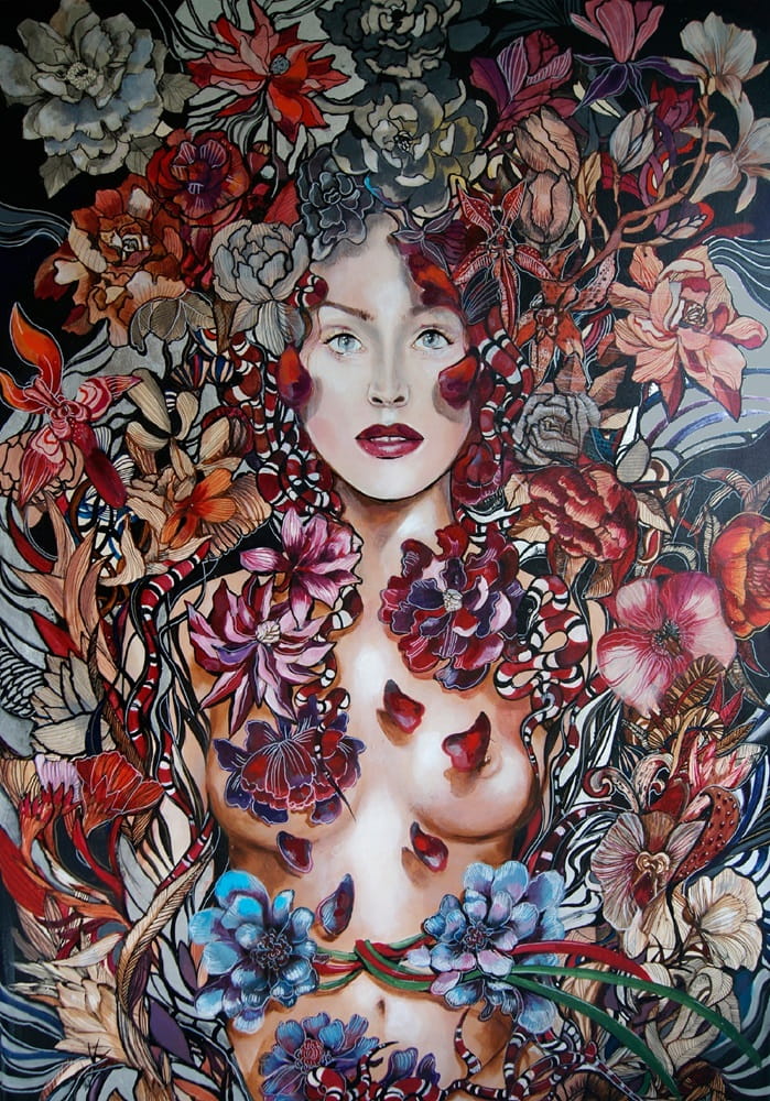Art-plakat „Snejki Gucia” 70/100 cm to kopia obrazu Maggie Piu z cyklu „Fashion Games”, inspirowanego światem mody.
