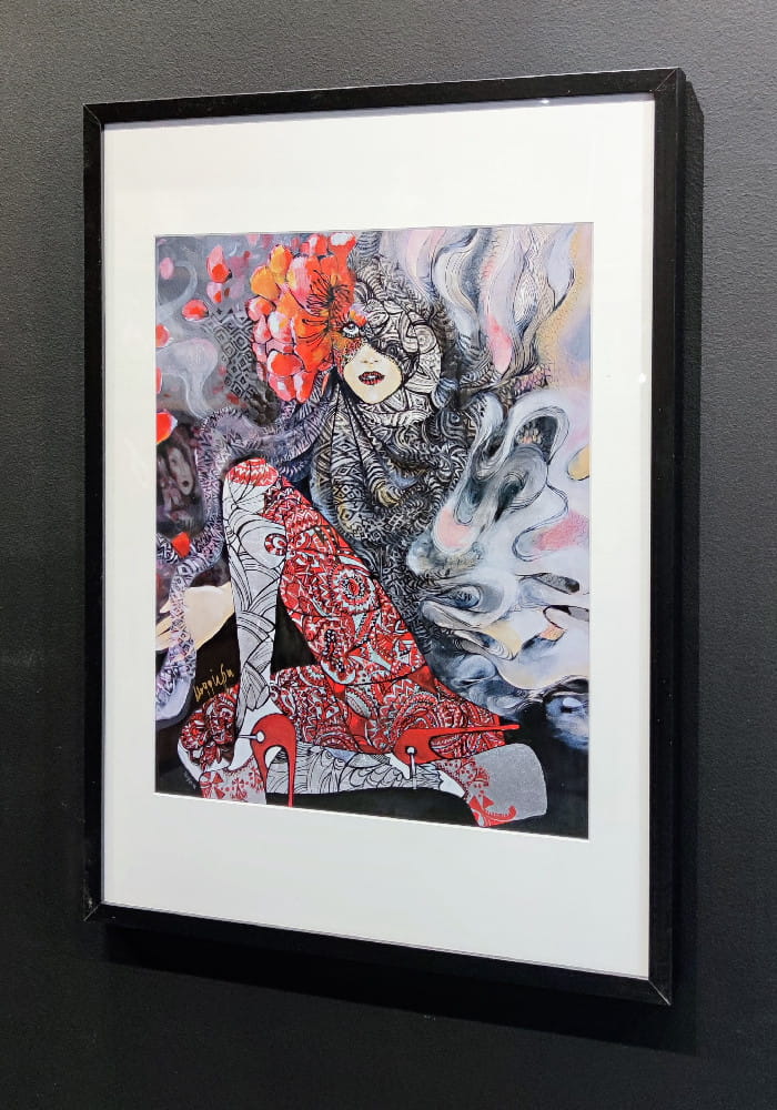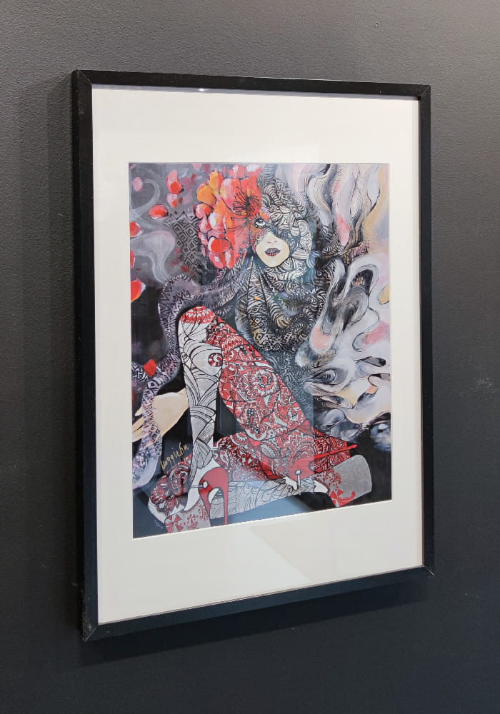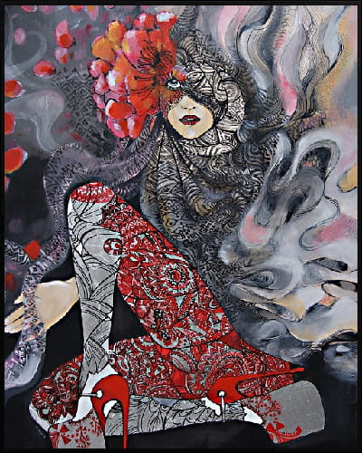 Art-plakat „W kurpiowskich rajstopach” 40x50 cm to kopia obrazu Maggie Piu z cyklu „Acupictura, pictura, tattoo”, inspirowanego kulturami świata, polskim folklorem, chińskimi i japońskimi gejszami, tatuażem, haftem i koronką.