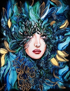 Art-plakat „Malachitowa Medusa Mayo” 40x50 cm to kopia obrazu Maggie Piu z cyklu „Goldivy”, barokowej, bogatej zdobniczo, złotej serii inspirowanej między innymi wzorami z dawnych tkanin, w której pojawiają się również rozmaite motywy stale obecne w twórczości Maggie Piu.