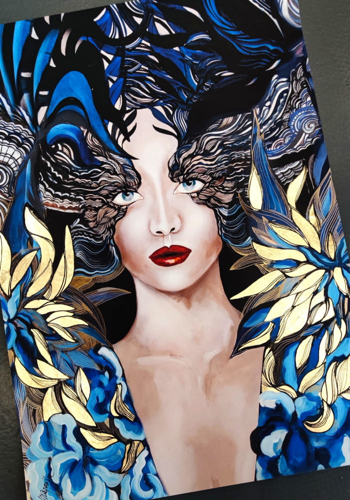 Art-plakat „Goldiva Szafiro” 50/70 cm to kopia obrazu Maggie Piu z cyklu „Goldivy”, barokowej, bogatej zdobniczo, złotej serii inspirowanej między innymi wzorami z dawnych tkanin, w której pojawiają się również rozmaite motywy stale obecne w twórczości Maggie Piu.
