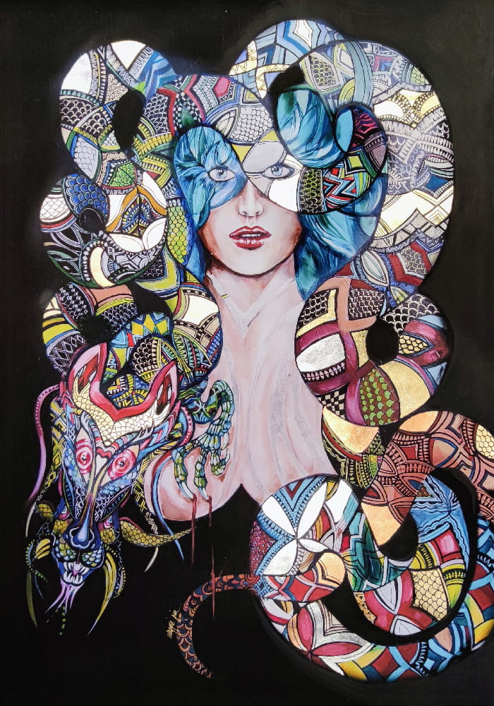 Art-plakat "Kiedy Twój Smok kocha Cię za bardzo" 50/70 cm to kopia obrazu Maggie Piu z cyklu "Magiczny Teatr Piu", w którym malarka powraca do swojej fascynacji fantastyką, nawiązuje do realizmu magicznego i baśniowej ornamentyki.