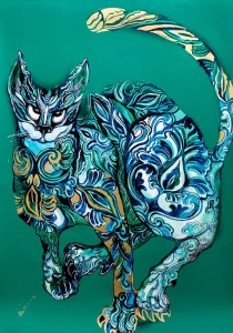 indywidualnie zdobiony, ręcznie wykończony farbami przez Maggie Piu. Bazując na podstawowej wersji plakatu Malachitowa Cat-50x70 cm autorka domalowuje złocenia, tworząc efektowny wizualnie ręcznie zdobiony egzemplarz kolekcjonerski. Istnieje możliwość dedykacji oraz zmiany formatu.