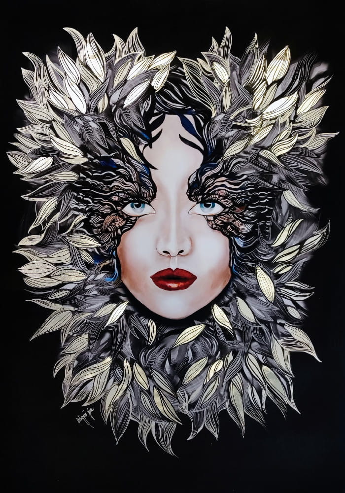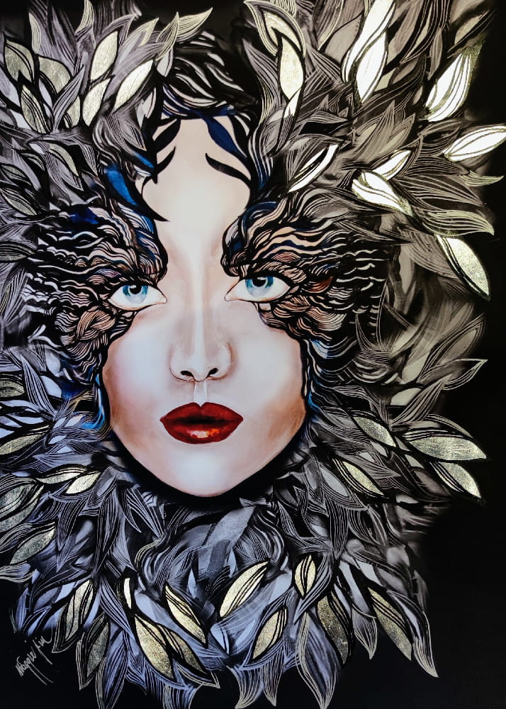 Art-plakat „Medusa Silver Siostra Szafiro” 50/70 cm to wersja obrazu Maggie Piu z cyklu „Goldivy”, barokowej, bogatej zdobniczo, złotej serii inspirowanej między innymi wzorami z dawnych tkanin, w której pojawiają się również rozmaite motywy stale obecne w twórczości Maggie Piu.