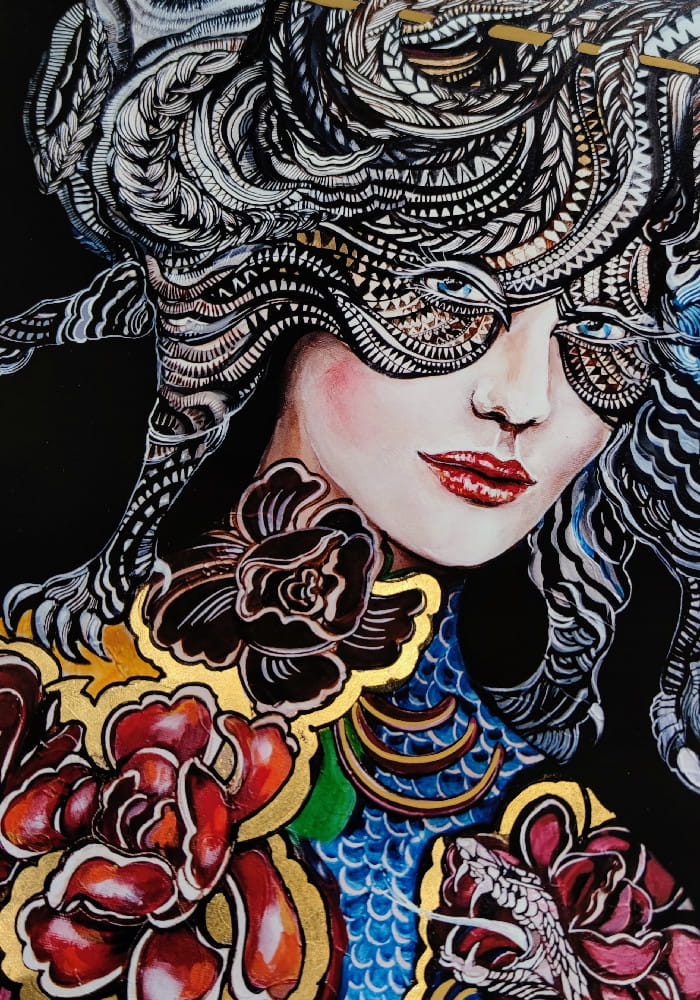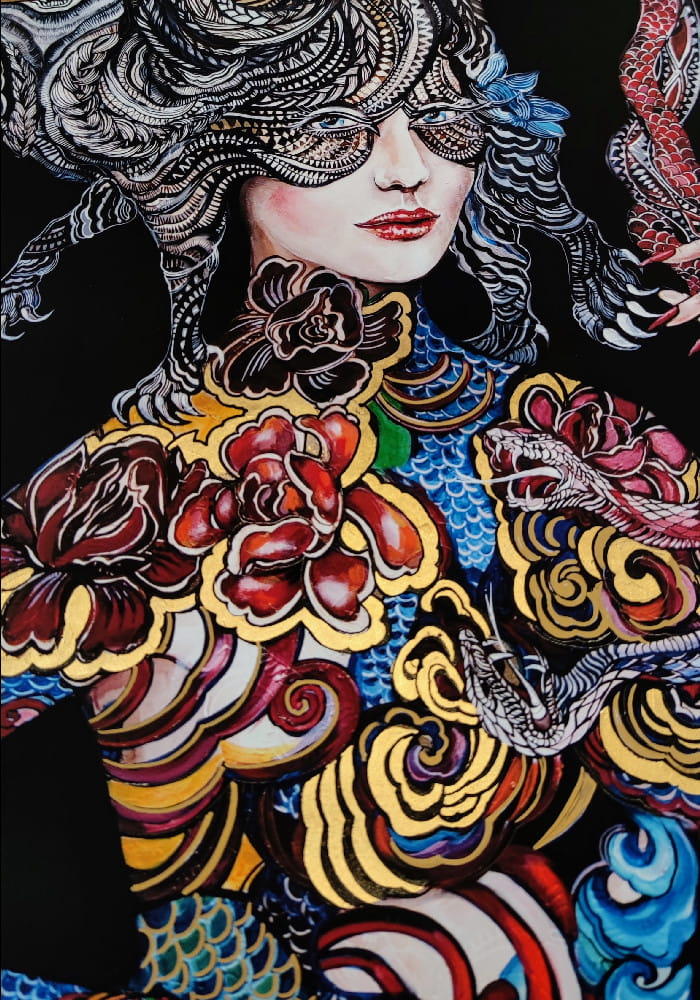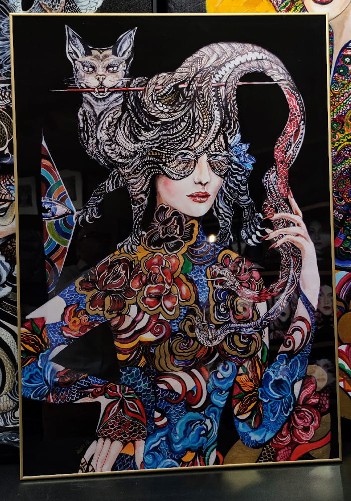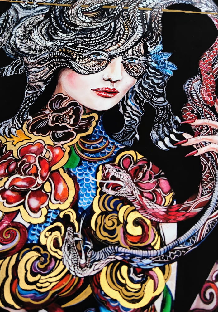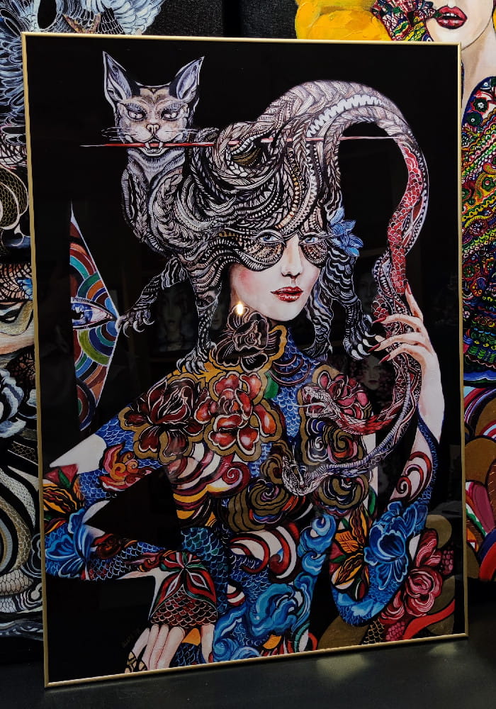 indywidualnie zdobiony, ręcznie wykończony przez Maggie Piu. Bazując na podstawowej wersji plakatu "Dwa węże walczą o me serce, lecz moja głowa należy do Kota" -70x100 cm autorka domalowuje elementy graficzne, tworząc efektowny wizualnie ręcznie zdobiony egzemplarz kolekcjonerski. Istnieje możliwość dedykacji oraz zmiany formatu.