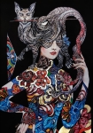 Art-plakat „Dwa węże walczą o me serce, lecz moja głowa należy do Kota” 70/100 cm to kopia obrazu Maggie Piu z cyklu „Magiczny Teatr PIU”, w którym malarka powraca do swojej fascynacji fantastyką, nawiązuje do realizmu magicznego i baśniowej ornamentyki.