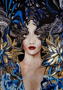 Art-plakat „Goldiva Szafiro” 70/100 cm to kopia obrazu Maggie Piu z cyklu „Goldivy”, barokowej, bogatej zdobniczo, złotej serii inspirowanej między innymi wzorami z dawnych tkanin, w której pojawiają się również rozmaite motywy stale obecne w twórczości Maggie Piu.