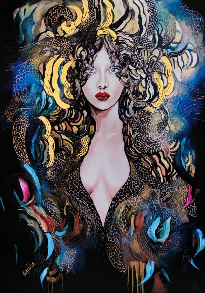 indywidualnie zdobiony, ręcznie wykończony farbami przez Maggie Piu. Bazując na podstawowej wersji plakatu Goldiva Tokage -70x100 cm autorka domalowuje złocenia, tworząc efektowny wizualnie ręcznie zdobiony egzemplarz kolekcjonerski. Istnieje możliwość dedykacji oraz zmiany formatu.