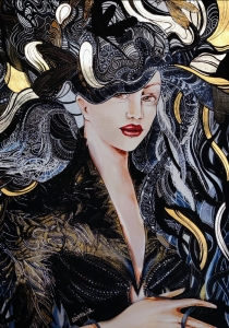 Art-plakat „Igły Aleksandra Gold-Silver” 70x100 cm to kopia obrazu Maggie Piu z cyklu „Fashion Games”, inspirowanego światem mody.