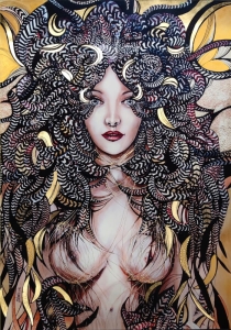 indywidualnie zdobiony, ręcznie wykończony farbami przez Maggie Piu. Bazując na podstawowej wersji plakatu Lady Mida II gold - 70x100 cm autorka domalowuje złocenia, tworząc efektowny wizualnie ręcznie zdobiony egzemplarz kolekcjonerski. Istnieje możliwość dedykacji oraz zmiany formatu.