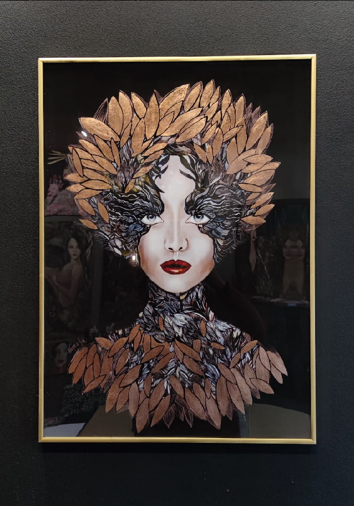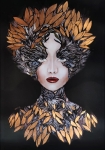 Art-plakat „Lady Siostra Szafiro Copper” 70x100 cm to kopia obrazu Maggie Piu z cyklu „Goldivy”, barokowej, bogatej zdobniczo, złotej serii inspirowanej między innymi wzorami z dawnych tkanin, w której pojawiają się również rozmaite motywy stale obecne w twórczości Maggie Piu.