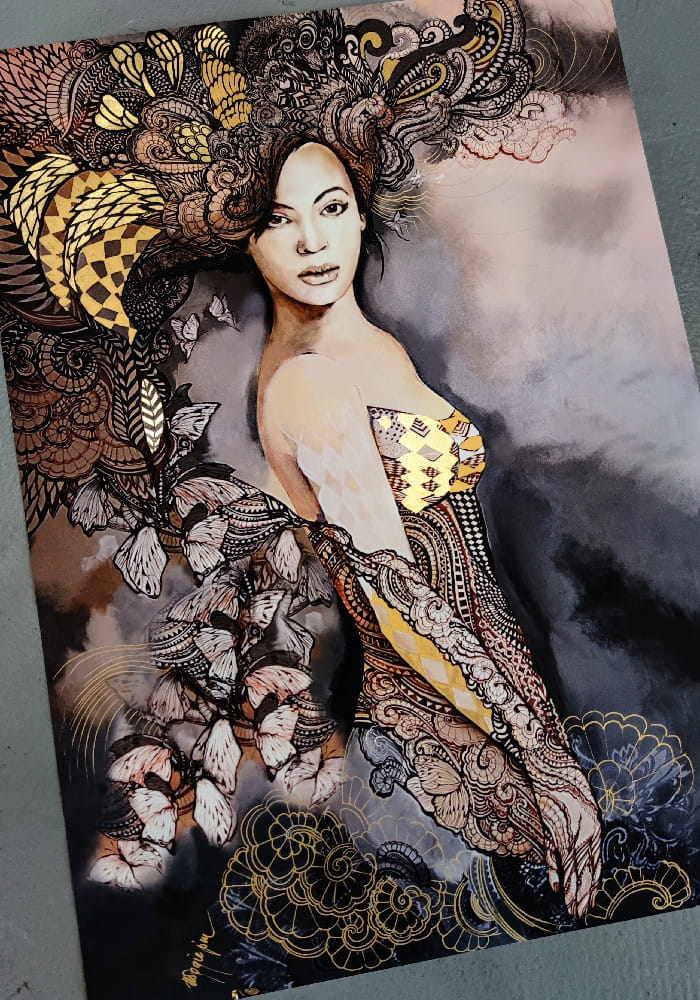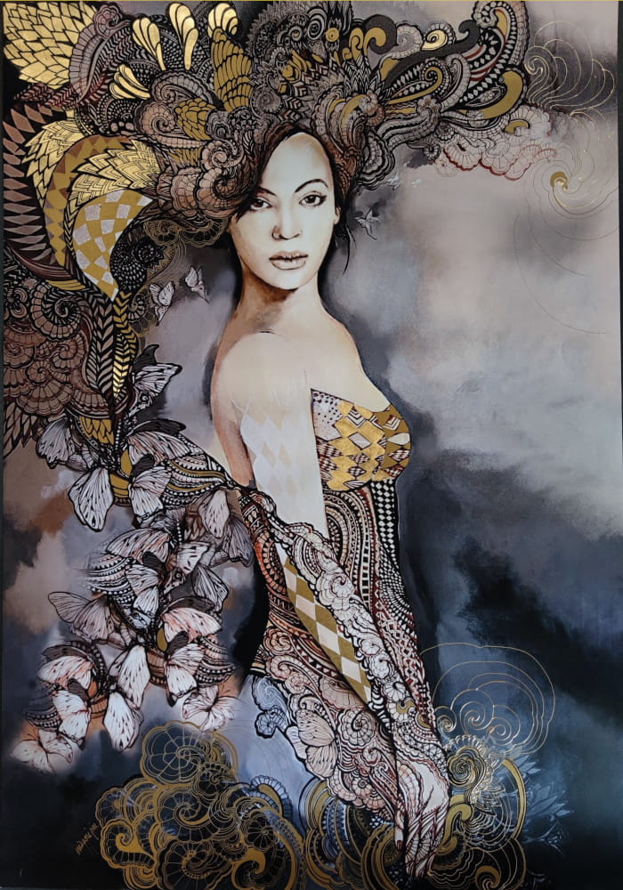 indywidualnie zdobiony, ręcznie wykończony przez Maggie Piu. Bazując na podstawowej wersji plakatu Madame Butterfly Grey -70x100 cm autorka domalowuje złote elementy graficzne, tworząc efektowny wizualnie ręcznie zdobiony egzemplarz kolekcjonerski. Istnieje możliwość dedykacji oraz zmiany formatu.
