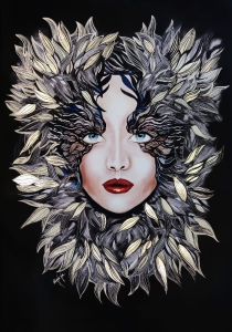 Art-plakat „Medusa Silver Siostra Szafiro” 70x100 cm to kopia obrazu Maggie Piu z cyklu „Goldivy”, barokowej, bogatej zdobniczo, złotej serii inspirowanej między innymi wzorami z dawnych tkanin, w której pojawiają się również rozmaite motywy stale obecne w twórczości Maggie Piu.
